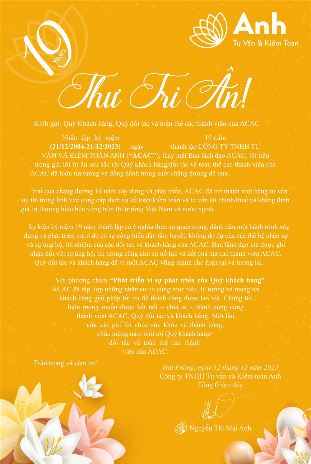 Kính thưa các Quý vị khách quý cùng toàn thể CBCNV công ty! Những ngày cuối năm, cơn gió thoảng lay nhẹ chiếc lá mang đến khí hậu trong lành, mát mẻ khiến cho cảnh vật căng tràn sức sống, mọi người xích lại gần nhau hơn trao nhau ánh mắt lấp lánh và nụ cười tươi trẻ. Lướt qua dòng chảy thời gian trên cuốn lịch, mọi người dừng lại 21/12/2023, long trọng kỷ niệm 19 năm (21/12/2004-21/12/2023) ngày thành lập Công ty TNHH Tư vấn và Kiểm toán Anh (‘‘ACAC’’). Nhân dịp sinh nhật tròn 19 năm của ACAC, chúng tôi xin cam kết nỗ lực hết mình vì sự tin tưởng, hợp tác của Quý khách hàng – Quý đối tác.