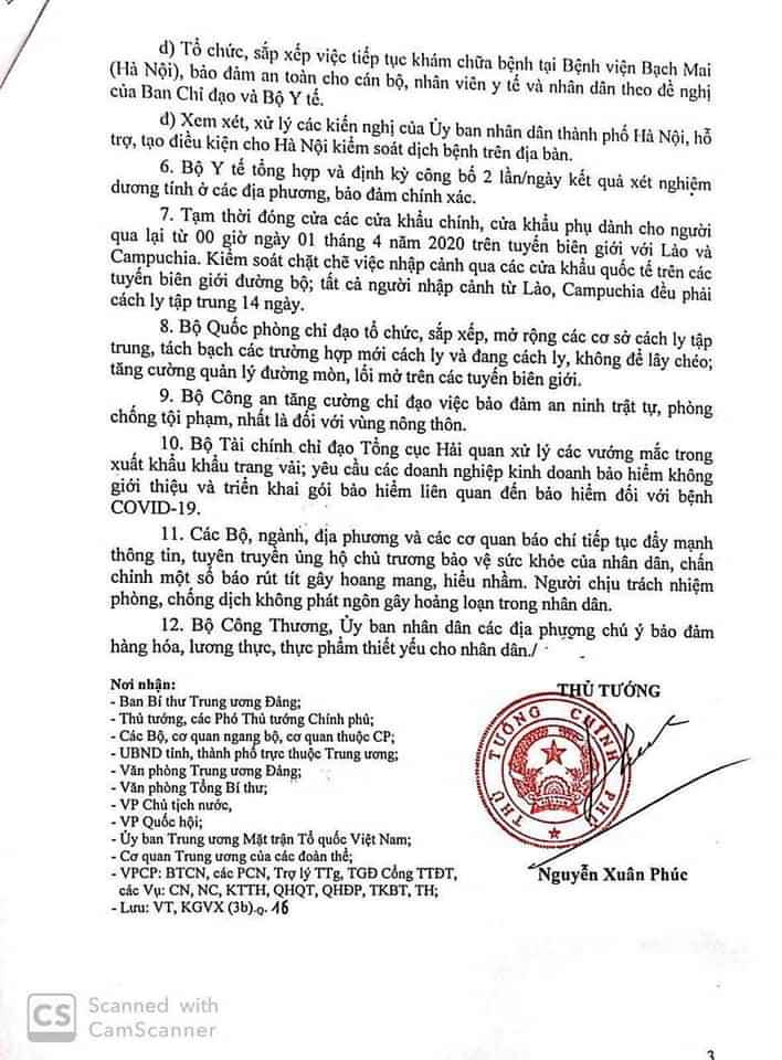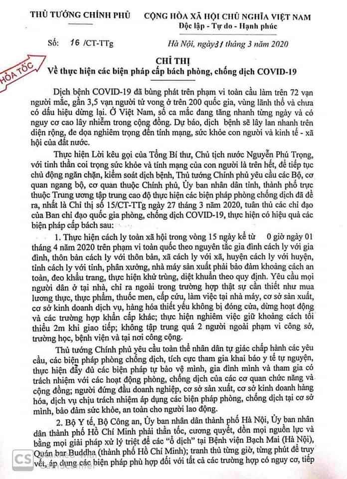 Dịch bệnh COVID-19 đã bùng phát phên phạm vi toàn cầu làm trên 72 van người mắc, gần 3,5 vạn người tử vong ở trên 200 quốc gia và vùng lãnh thổ và chưa có dấu hiệu dừng lại. Ở Việt Nam, số ca mắc đang tăng nhanh từng ngày và có nguy cơ cao lây nhiễm trong cộng đồng. Dự báo, dịch bệnh sẽ lây lan nhanh trên diện rộng, đe doạ nghiêm trọng đến tính mạng, sức khoẻ con người và kinh tế - xã hội của đất nước theo công văn hoả tốc đính kèm.