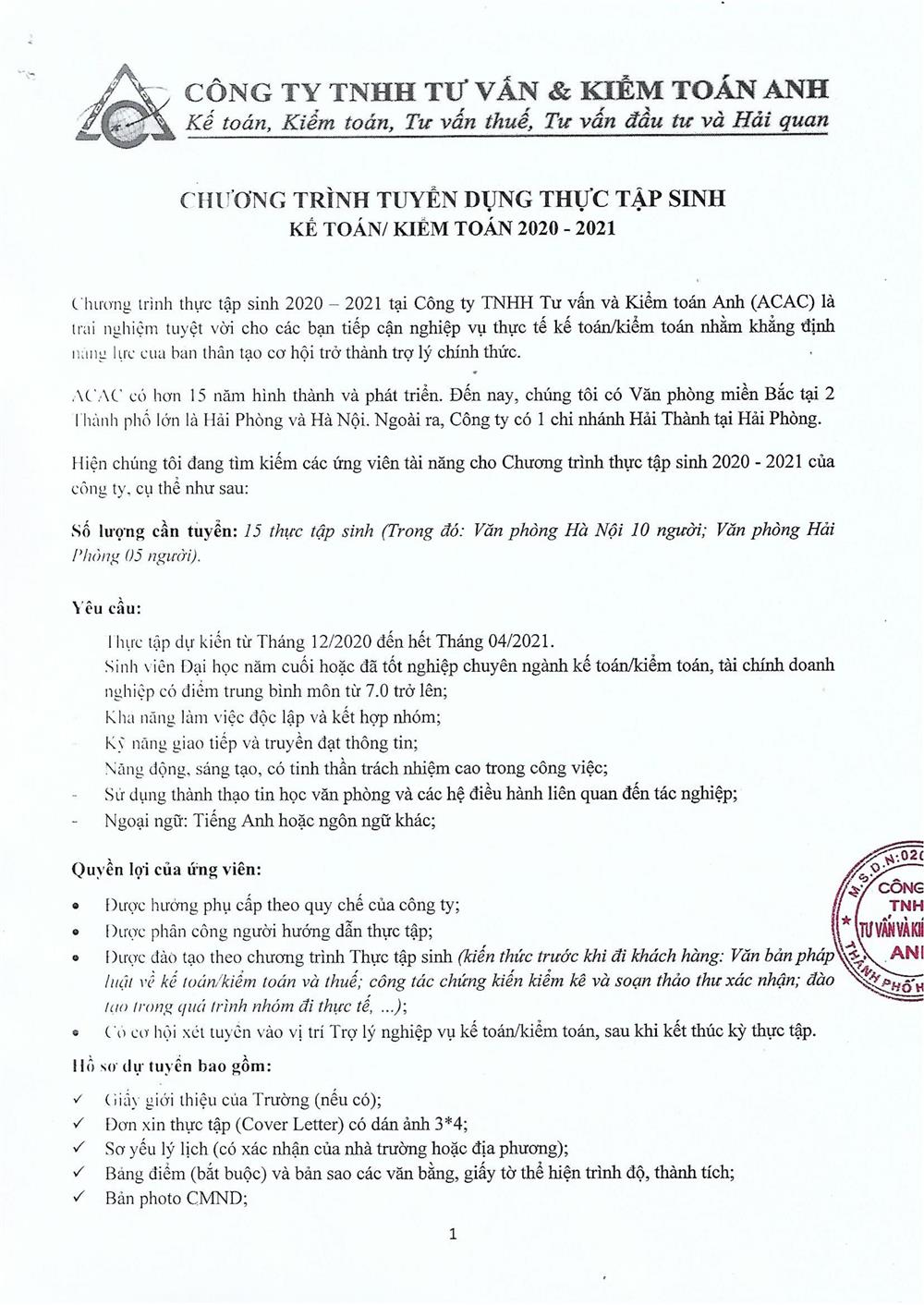 CHƯƠNG TRÌNH TUYỂN DỤNG THỰC TẬP SINH KẾ TOÁN/ KIỂM TOÁN 2020 - 2021