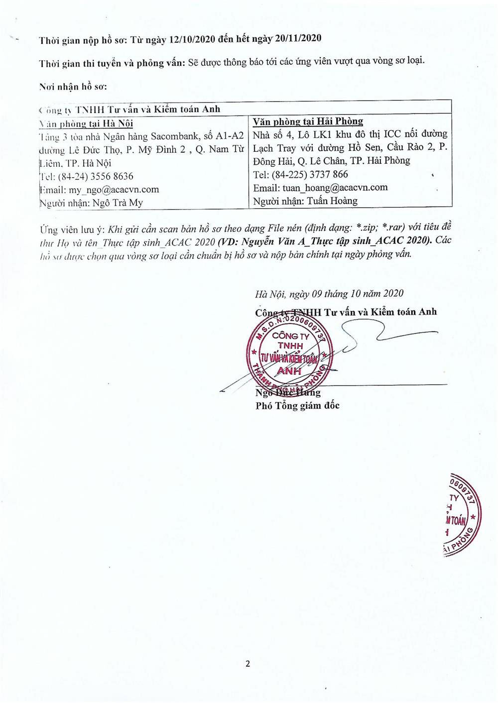 Chương trình thực tập sinh 2020 – 2021 tại Công ty TNHH Tư vấn và Kiểm toán Anh (ACAC) là trải nghiệm tuyệt vời cho các bạn tiếp cận nghiệp vụ thực tế kế toán/kiểm toán nhằm khẳng định năng lực của bản thân tạo cơ hội trở thành trợ lý chính thức.