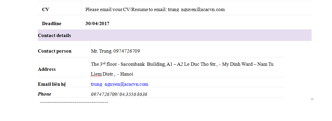 Điện thoại: (84-24) 3556 8636  hoặc điện thoại tiếp nhận thông tin 0977 730 088 Mr Tuấn Hoàng