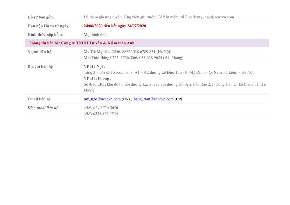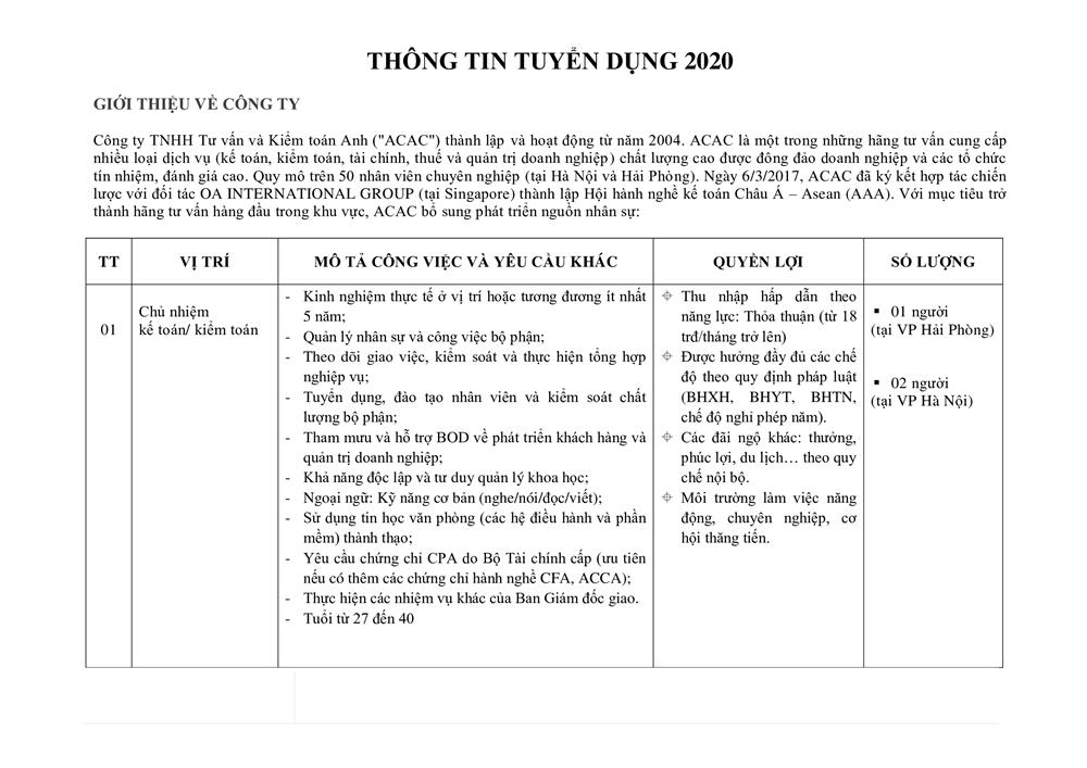 THÔNG TIN TUYỂN DỤNG NHÂN SỰ 2020 - Chủ nhiệm Kế toán – Kiểm toán