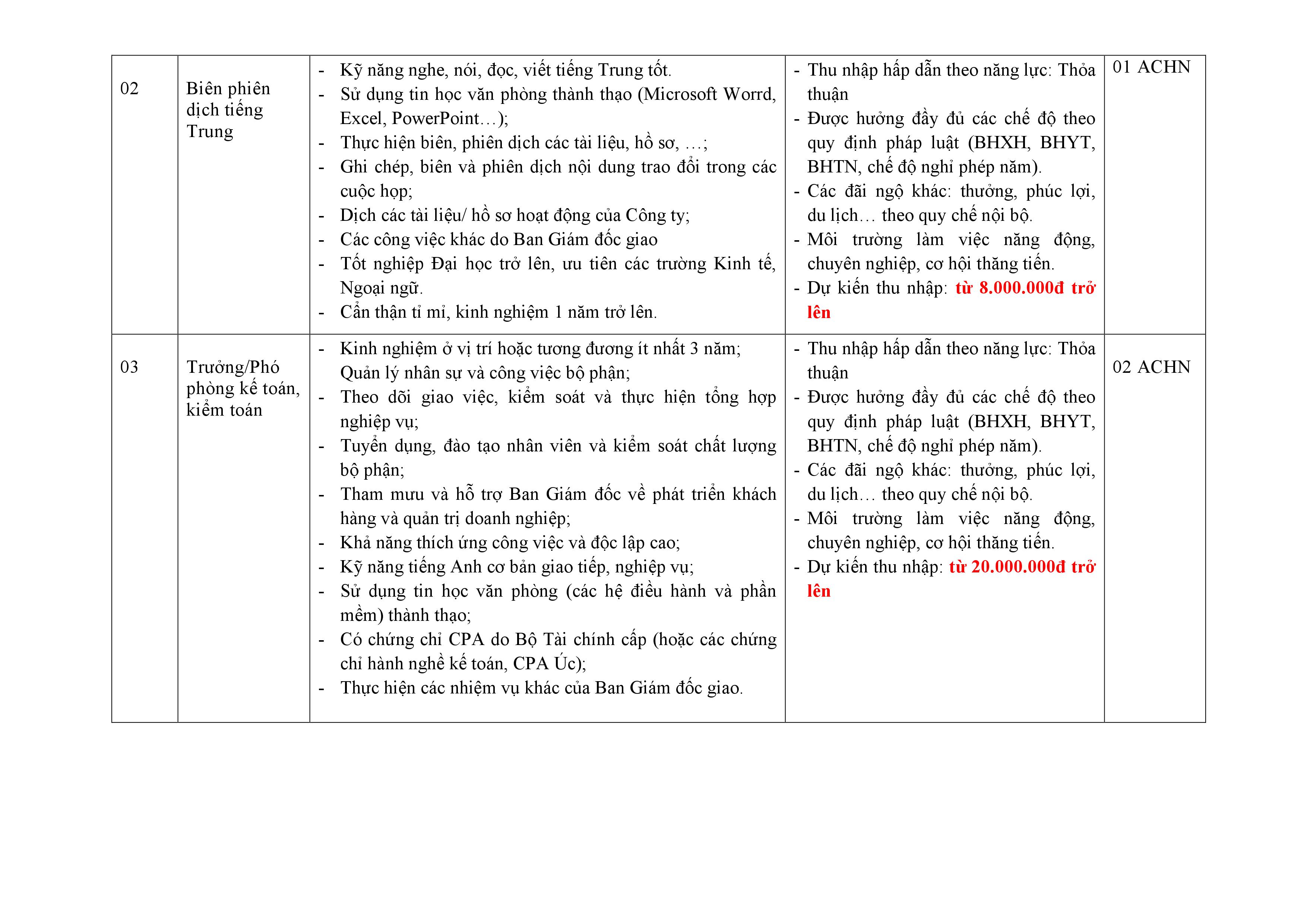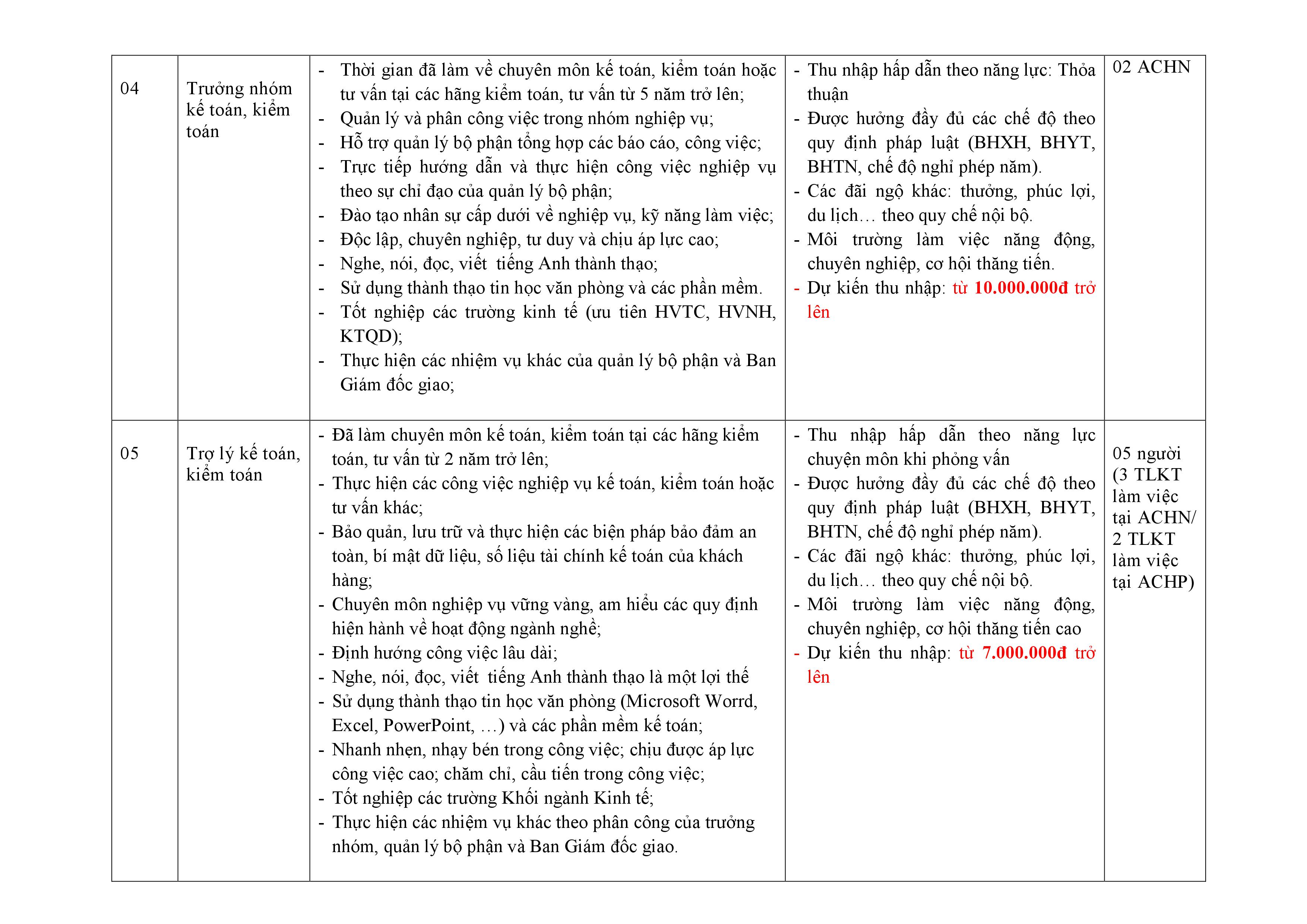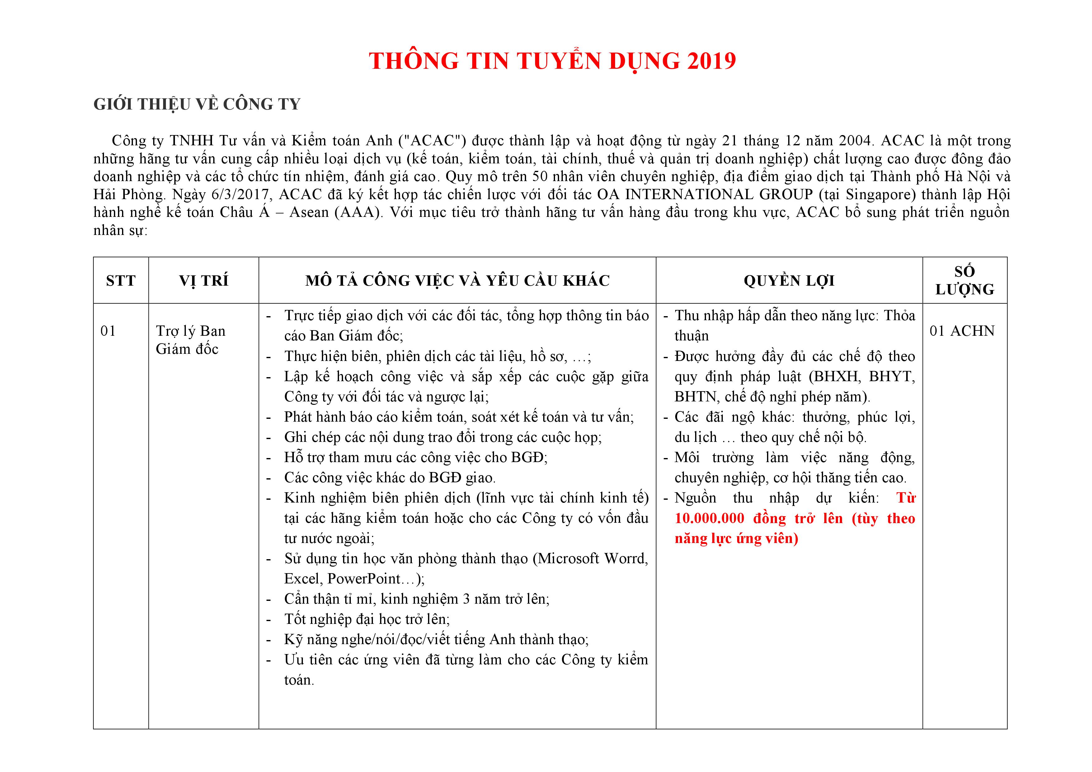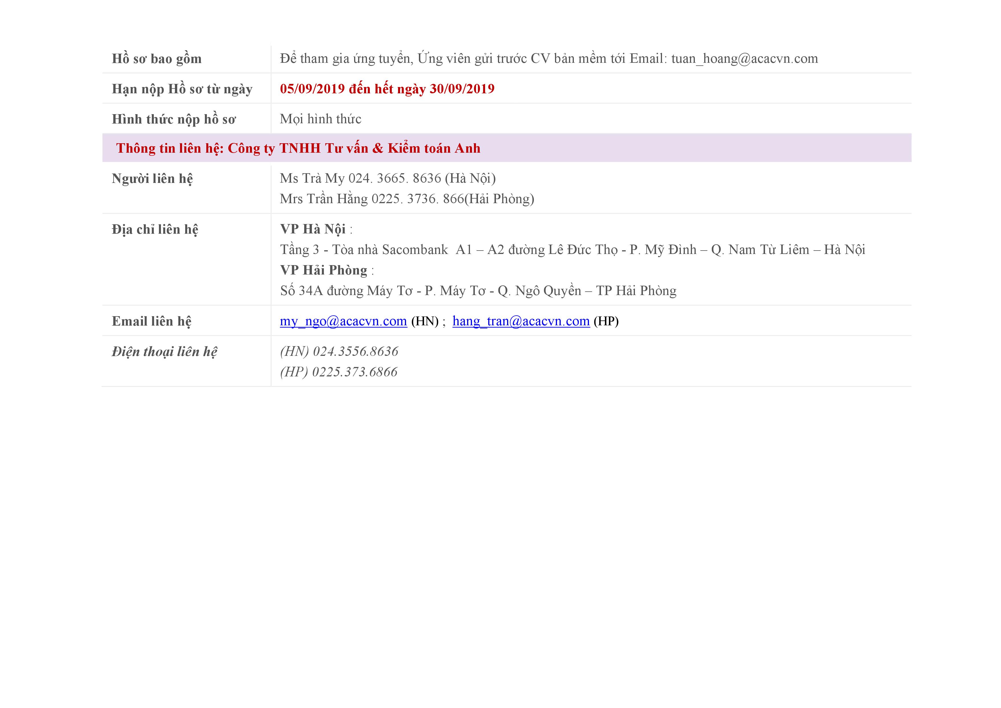 Với mục tiêu ngày càng phát triển mở rộng trở thành hãng tư vấn thương hiệu tại Việt Nam thì Công ty TNHH Tư vấn và Kiểm toán Anh (ACAC) đặc biệt quan tâm tới đội ngũ nhân sự. Trải qua 15 năm hoạt động đến nay ACAC có hai văn phòng (Hà Nội và Hải Phòng), một chi nhánh và số lượng cán bộ nhân viên gần 50 người. Nhằm bổ sung nguồn nhân sự mở rộng phát triển tại Việt Nam và khu vực Asean (Hiệp hội kế toán Châu Á – Asean do Công ty TNHH Tư vấn và Kiểm toán Anh ký kết hợp tác với đối tác OA tại Singapore thành lập) cần tuyển những vị trí sau:
